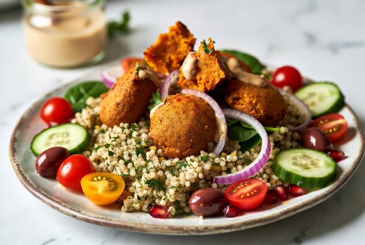 - Assemble Your Plate: On each plate, create a bed of the herbed couscous. Artfully arrange the baked sweet potato falafel bites, sliced cucumber, halved cherry tomatoes, Kalamata olives, and thinly sliced red onion over the couscous.